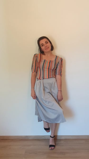 Le débardeur est la pièce la plus simple puisque l'esprit de la chemise y est conservé, pour la jupe nous avons du jouer au Tetris pour placer les pièces nécessaires dans le bas de la chemise et les manches. Ces deux vêtements transformés peuvent se porter à l'infini et en toute saison : ensemble ou séparément.