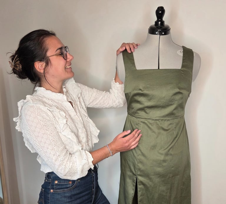 Sa demande était claire, elle avait deux mariages au cours de l'été et souhaitait une robe de cérémonie sur-mesure qu'elle puisse mette à chacun d'entre eux. Après avoir écouté ses besoins : pas plus long que mi mollet ou pouvoir porter un soutien-gorge par exemple mais aussi ce qu'elle n'aimait pas. Je lui ai proposé plusieurs modèles de robes et des tissus qui pourraient convenir.